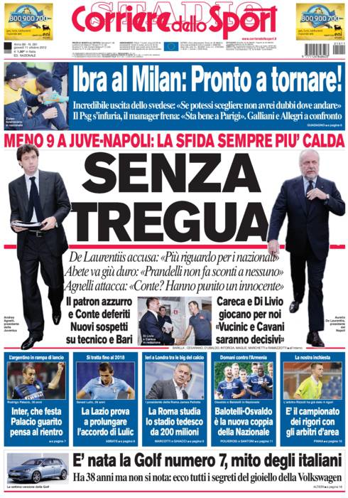 Il Corriere dello Sport: Meno nove giorni alla super sfida tra Juve e Napoli. Continuano le discussioni sul presunto accordo tra Prandelli e Conte