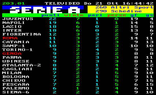 Il posticipo Genoa-Roma delle 20.30 non influirà sulle posizioni di testa della classifica. L’ottava giornata ha sancito la sola sconfitta del Napoli ai piani alti, con la Juve che ha allungato di 3 punti sugli azzurri; Lazio e Inter, con le rispettive vittorie, sono invece ad una lunghezza dalla squadra di Mazzarri. Il Napoli mantiene la seconda piazza ma perde due primati: quello dell’imbattibilità e quello di miglior difesa che ora spetta alla Juve. Incredibile ma vero, il Milan con la quinta sconfitta, ristagna al terzultimo posto con Bologna, Chievo e Pescara.