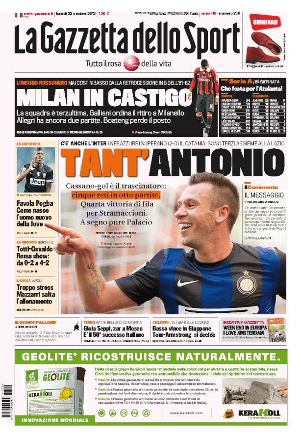 Gazzetta dello Sport: L’Inter supera 2-0 il Catania grazie ad un grande Cassano; in gol anche Palacio per la quarta vittoria di fila dei nerazzurri