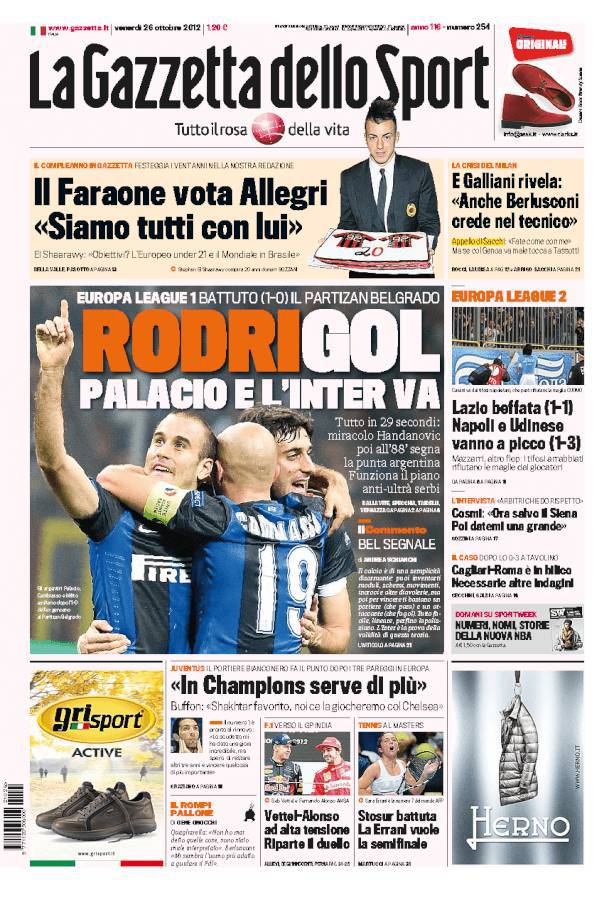 Gazzetta dello sport: L’argentino Palacio regala il successo all’Inter, Lazio raggiunta sul pareggio nel finale, a picco Napoli e Udinese