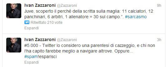Ivan Zazzaroni si è divertito a fare un pò di sarcasmo sul proprio profilo twitter circa la Juventus. In questi giorni si continua a discutere degli errori arbitrali di Catania e il giornalista ha pubblicato la seguente frase: “Juve, scoperto il perché della scritta sulla maglia: 11 calciatori, 12 panchinari, 6 arbitri, 1 allenatore = 30 sul campo“. Tweet che evidentemente non è andato giù a tutti, in particolare ai tifosi bianconeri che hanno protestato contro Zazzaroni, costretto poi a ‘cinguettare’ un altro messaggio: “Twitter lo considero una parentesi di cazzeggio, e chi non l’ha capito farebbe meglio a navigare altrove. Oppure…”
