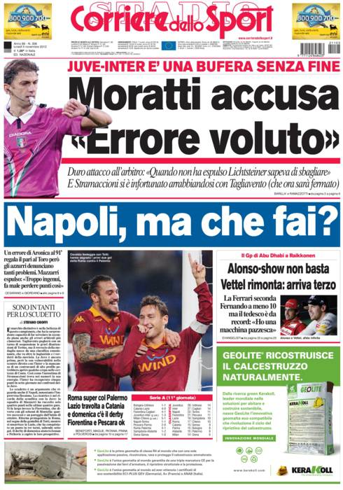 Corriere dello Sport: Un clamoroso errore di Aronica rovina la festa al ‘San Paolo, espulso anche Mazzarri. Moratti attacca l’arbitro di Juve-Inter