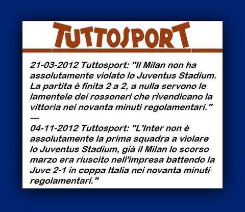 Le perplessità sul giornale torinese Tuttosport erano già tante, ma questa foto trovata sul web mette davvero in discussione la credibilità della testata giornalistica. L’argomento di cui tratta la foto è l’inviolabilità dello Juventus Stadium: prima il Milan, in occasione della semifinale di ritorno di Coppa Italia dello scorso campionato, o l’Inter sabato scorso? Nemmeno Tuttosport sa darsi una risposta dimostrando la poca coerenza che ha sempre caratterizzato questo giornale.