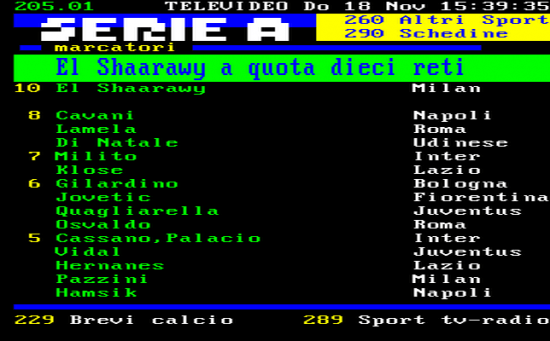 Con la doppietta messa a segno ieri sera al San Paolo, il giovane El Shaarawy si porta da solo al comando della classifica marcatori. Alle sue spalle il trio Cavani, Di Natale, Lamela. Tuttavia, il giovane romanista avrà la possibilità di agganciare il rossonero lunedì sera, quando si giocherà Roma – Torino.