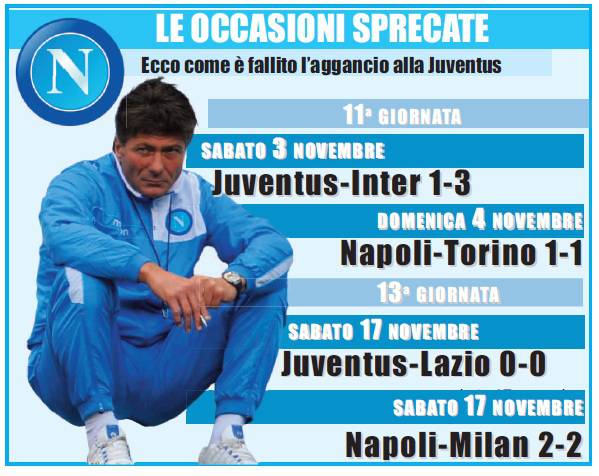 Ci risiamo. Ogni qualvolta che il Napoli deve fare il passo per diventare veramente grande si inceppa. Inutile parlare delle occasioni sprecate nei campionati scorsi. Il passato è passato, adesso vale la pena pensare solo al presente. Purtroppo neanche nel torneo attuale la squadra azzurra riesce ad essere una big a tutti gli effetti. Lo sanno anche le pietre che quest’anno il Napoli ha programmato di giocarsi lo scudetto fino alla fine. A differenza della passata stagione, Mazzarri fu chiaro già nel ritiro di Dimaro: “Ci teniamo a fare benissimo da subito in serie A”. Proprio per questo si era fatto costruire una rosa capace di poter dominare in campionato e fare bella figura in Europa League. Inizialmente aveva deciso di optare per i titolari la domenica e le seconde linee di giovedì. Le cose sono andate bene fino ad un certo punto ma poi si è dovuto cambiare registro utilizzando i campioni anche nella competizione internazionale per evitare di perdere il treno che porta ai sedicesimi di finale. Ma veniamo al campionato. L’incipit è stato ottimale, fino alla trasferta di Torino con la Juve, il Napoli si era fermato solo a Catania conquistando uno 0-0 nonostante una superiorità numerica durata per tutta la partita. Per il resto aveva sempre vinto. Purtroppo allo Stadium, per un episodio, si dovette alzare bandiera bianca e da allora sono venuti fuori tutti i limiti di un gruppo che sembra non riuscire a sostenere i grandi eventi. Con la Signora a +6 il campionato sembrava già chiuso ed invece anche i bianconeri hanno avuto degli scivoloni. Qualche defaillance la mostrò in casa della Fiorentina e il pareggio finale fu un regalo. I guai, invece, sono arrivati in casa contro Inter e Lazio. Le due sfide casalinghe hanno fruttato alla Juve solo un punto. Quale migliore occasione per il Napoli per approfittarne e riavvicinarsi alla vetta. Ebbene, nelle stesse giornate, contro Torino e Milan al San Paolo, Cavani e compagni sono stati capaci di fare harakiri e gettare al vento due vittorie che erano ormai chiuse in cassaforte. Risultato? La Juventus ha ringraziato perchè il gap è rimasto quasi invariato. Vedendo i risultati di ieri la rabbia è maggiore. Con il pareggio a San Siro dell’Inter contro il Cagliari il Napoli avrebbe potuto superare i nerazzurri e confermarsi nuovamente come seconda forza del campionato. Invece, è rimasto terzo ed è stato agguantato da una Fiorentina che non conosce più soste. Il napoletano Montella sta facendo un lavoro egregio con la Viola e per forza di cose anche lui sogna ad occhi aperti. E per come si sono messe le cose può essere il vero pericolo della Juventus visto che ha conquistato cinque successi consecutivi. E per di più non ha le distrazioni delle Coppe durante la settimana. Ad oggi neanche più la zona Champions è sicura. Sarebbe davvero assurdo arrivare a maggio senza poter neanche disputare la vecchia Coppacampioni. Sarebbe un fallimento per una squadra che più volte è stata ritenuta la vera anti-Juventus. Per poter essere al pari della Signora, però, a gennaio si dovrà fare qualcosa. Nulla contro i panchinari attuali, ma sabato sera, guardando le formazioni, ci si è resi conto della grande differenza tra i giocatori a disposizione di Mazzarri e quelli di Allegri. Mentre il rossonero aveva seduto al suo fianco Robinho, Pato, Pazzini, Yepes, Flamini ed Emanuelson, il sor Walter poteva contare su Aronica, Grava, Fernandez, Mesto, Donadel e Vargas. Al Napoli manca un ciclo vincente di partite che gli consenta di incassare punti pesanti. Mazzarri sperava in una rinascita dopo l’exploit con il Genoa ed invece ha dovuto accontentarsi di un pareggio che gli ha lasciato molto amaro in bocca. Si è mangiato letteralmente le mani quando ha visto i suoi sprecare ed El Shaarawy, invece, segnare nelle uniche occasioni che gli sono capitate. Se non ci fosse stato il successo di Marassi a quest’ora si starebbe parlando di crisi poichè in precedenza si era pareggiato con il Torino e perso a Bergamo contro l’Atalanta. L’unico modo per scacciare nuovamente le streghe è andare a vincere lunedì prossimo a Cagliari. In Sardegna si andrà senza lo squalificato Cavani e si affronterà una squadra che ieri ha sfiorato l’impresa in casa dell’Inter. La trasferta isolana, poi, è sempre stata difficile per i partenopei. C’è un odio atavico di Cellino per i colori azzurri e sistematicamente, ogni qualvolta che ospita il Napoli, chiama i tifosi a raccolta per cercare di riempire lo stadio.
