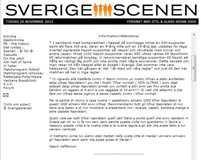 Un’altra vergognosa pagina del tifo viene scritta da questo sito internet di pseudo-tifosi svedesi. Un post carico di insulti e minacce nei confronti di Napoli e dei suoi tifosi; oltre alla voglia di rivalsa dopo lo spiacevole episodio dell’andata, relativo al tifoso svedese accoltellato a Napoli.