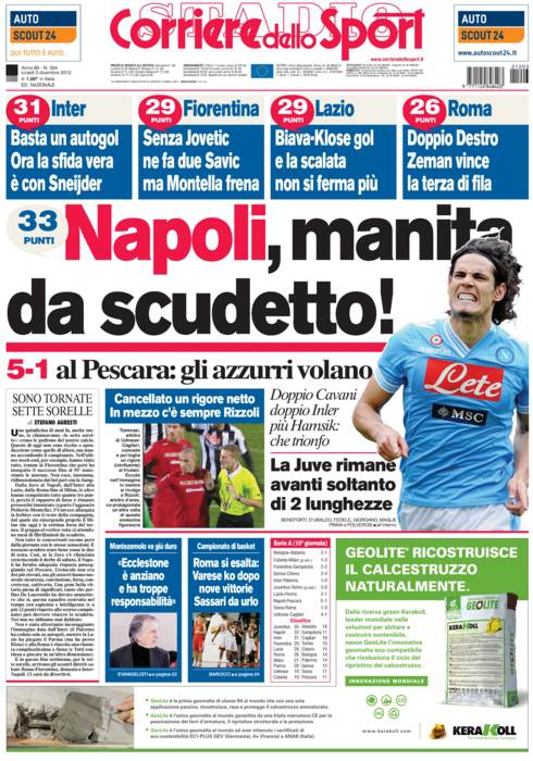 Il Corriere dello Sport: Il Napoli continua la corsa con la Juve. Bianconeri a -2