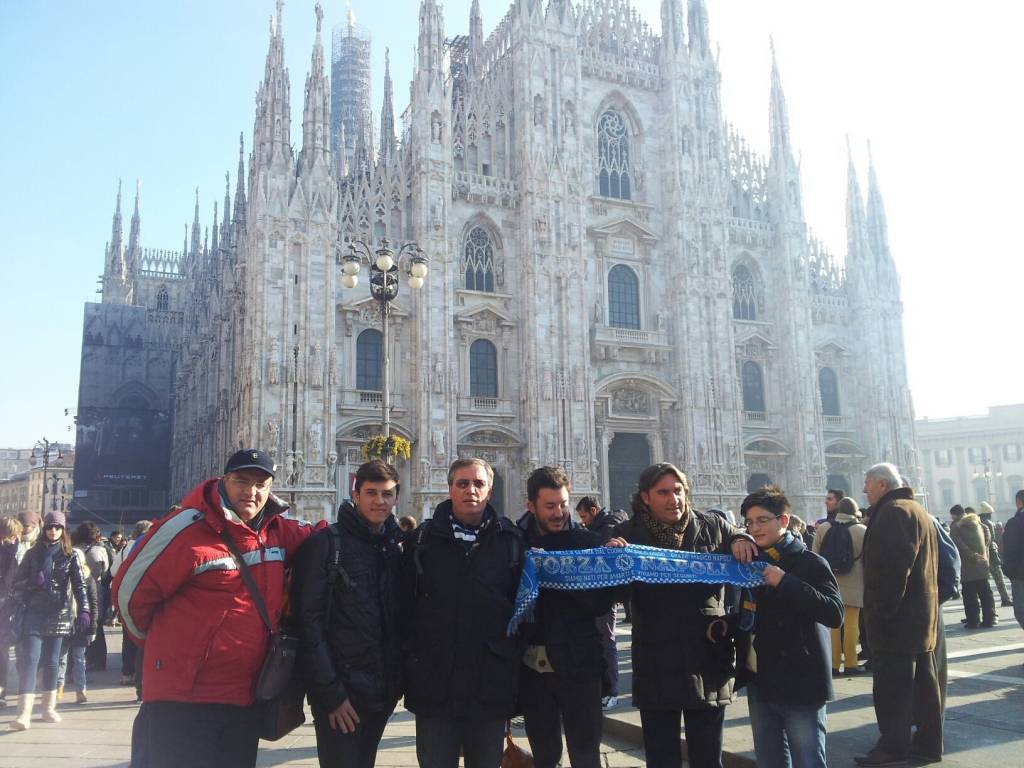 Una vera e propria marea azzurra si sta riversando a Milano. Questa sera a San Siro sono previsti circa seimila supporters del Napoli, provenienti dai dintorni del Nord o che hanno affrontato un lungo viaggio. Ecco ad esempio un gruppo di sostenitori partiti questa mattina da Napoli: hanno inviato una foto alla redazione di Napolicalciolive.com che li ritrae orgogliosi del vessillo azzurro a ‘Piazza Duomo’.