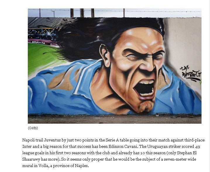 Il murales che il famoso writer Raffo ha dedicato a Cavani ha fatto il giro del mondo. Dopo l’attenzione ricevuta dai media italiani, ecco che anche yahoo sports celebra l’opera d’arte con un articolo in inglese, la lingua di chi inventò il calcio: