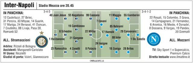 Questa sera di fronte Inter e Napoli che, come si evince dal grafico in foto, adottano entrambe la difesa a 3; linea a 4 a centrocampo con licenza agli esterni di spingere molto: interessanti a tal proposito saranno i duelli tra Zanetti e Zuniga e da un lato e Nagatomo e Maggio dall’altro; solo in attacco cambia un pò il modo di giocare: da una parte il classico tridente nerazzurro, Cassano-Milito-Palacio, che se la vedranno rispettivamente con Gamberini-Cannavaro-Britos; sull’altro fronte invece Hamsik, Insigne e Cavani rappresentano l’imprevedibilità che può scardinare i lunghi è statici difensori interisti. Parola al campo!