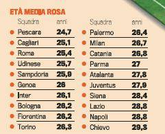 Interessante tabella, pubblicata sulla ‘Gazzetta dello Sport’, che riporta l‘età media delle squadre di serie A. Checchè se ne dica sulla politica di De Laurentiis di investire sui giovani, il Napoli si ritrova, insieme a Chievo e Lazio, una delle rose più ‘attempate‘ con 28,8 di età media. La squadra più giovane è invece il Pescara.