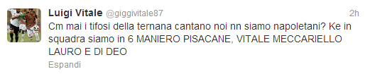 Luigi Vitale ha mostrato a tutti il suo orgoglio napoletano. Sul suo profilo ufficiale Twitter l’esterno sinistro della Ternana ha rilasciato un tweet dove chiede ai tifosi della sua attuale squadra il perchè dei cori contro i napoletani nonostante in rosa ci siano sei partenopei. Ecco il messaggio per intero: “Come mai i tifosi della Tenana cantano noi non siamo napoletani? In squadra ne siamo 6: MANIERO, PISACANE, VITALE, MECCARIELLO, LAURO E DI DEO”. Un tifoso prova a spiegargli la situazione e lui risponde. Un gesto che sicuramente apprezzeranno tutti i tifosi del Napoli.