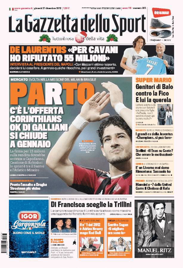RASSEGNA STAMPA – Le prime pagine dei quotidiani sportivi 27/12/201227/12/2012 di antoizzo CLICCA QUI PER ESSERE SEMPRE AGGIORNATO SUL TUO NAPOLI! A.I.