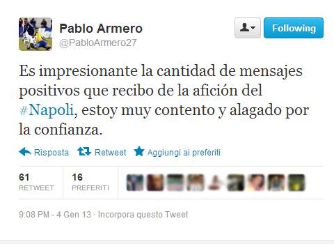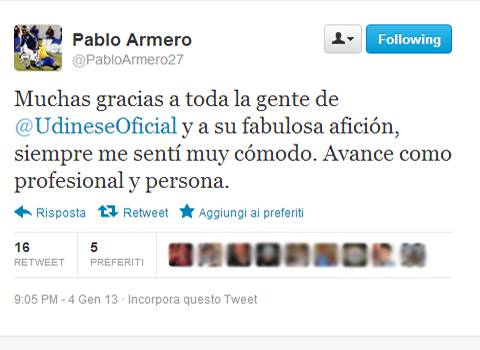 Pablo Armero può considerarsi un nuovo calciatore del Napoli. Il centrocampista dell’Udinese, infatti, anche su Twitter ha voluto eprimere il suo stato d’animo in vista dell’imminente trasferimento a Napoli: ““E’ impressionante la quantità di messaggi ricevuti dai tifosi del Napoli, sono molto soddisfatto e lusingato dal loro affetto. Ringrazio tutti la gente di Udine e la loro favolosa tifoseria. Mi sono sempre sentito a casa. Ora è il momento di fare passi avanti e progredire dal punto di vista personale e professionale”. Che Armero sia già del Napoli, lo si capisce anche dal mancato allenamento odierno con l’Udinese (CLICCA QUI PER LEGGERE). Infine, stando ad indiscrezioni, non è ancora del tutto definito questo importante affare (CLICCA QUI PER SAPERNE DI PIU’).