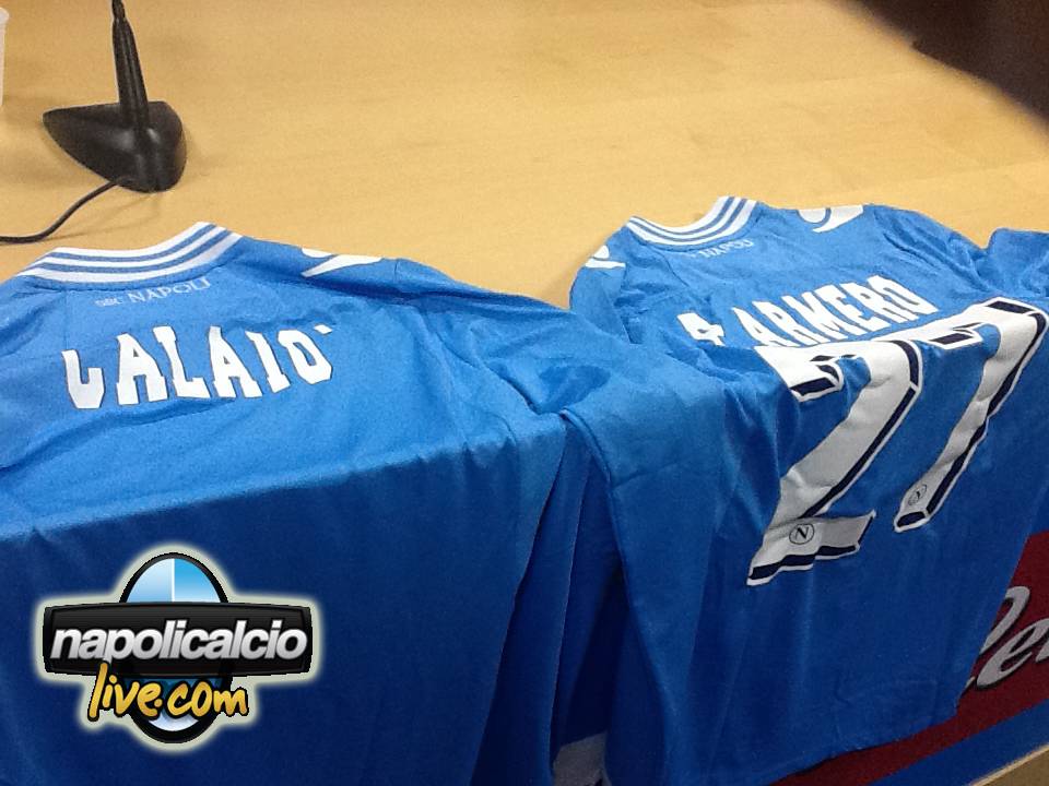Se per Pablo Armero era evidentemente scontata la scelta del numero di maglia, ovvero quel 27 che ha indossato anche a Udine, Calaiò attende ancora. La scelta dell’arciere è ricaduta sul numero 9 che però ancora non è stato stampato sulla sua nuova casacca azzurra. L’attaccante aspetta solo la cessione ufficiale di Vargas per poter sfoggiare la sua maglia da bomber. E allora ecco le foto delle due nuove maglie azzurre alla presentazione di quest’oggi a Castelvolturno (CLICCA QUI PER RILEGGERE LA CRONACA DELLA PRESENTAZIONE DI ARMERO E CALAIO‘).