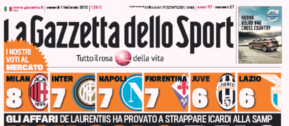 E’ il Milan la regina di questo mercato secondo la ‘Gazzetta dello Sport’. Non potrebbe essere altrimenti dopo l’acquisto di un fenomeno come ‘Super’ Mario Balotelli. Otto in pagella per i rossoneri, sette invece per Inter, Fiorentina e Napoli. Il voto degli azzurri sarebbe ulteriormente incrementato con gli acquisti annunciati dell’ultima ora ma il mercato del Napoli si chiude con 6 calciatori in entrata e sei in uscita (CLICCA QUI PER LEGGERE IL RIEPILOGO DI ACUISTI E CESSIONI DEL NAPOLI).