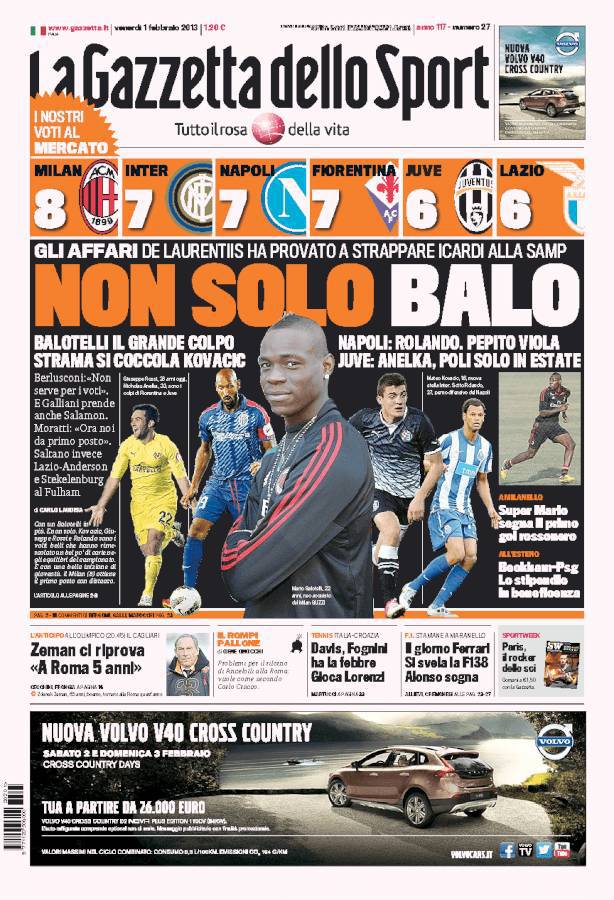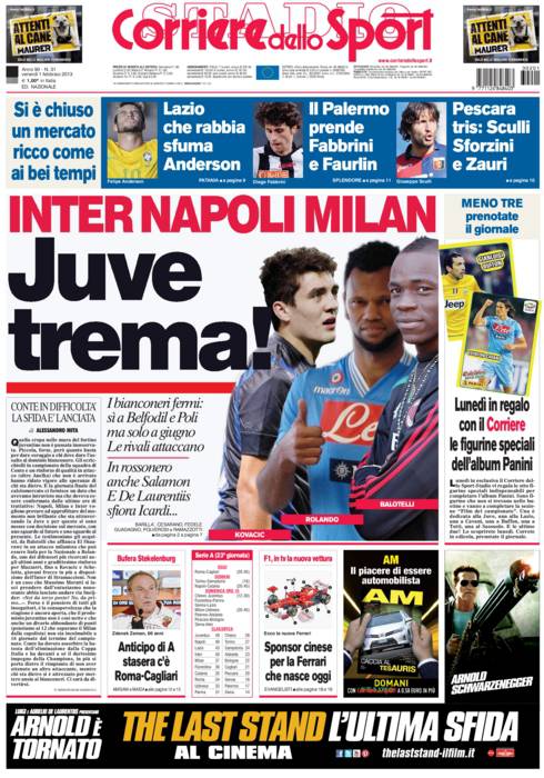 RASSEGNA STAMPA – Le prime pagine dei principali quotidiani sportivi 01/02/201301/02/2013 di antoizzo A.I. CLICCA QUI PER ESSERE SEMPRE AGGIORNATO SUL TUO NAPOLI!