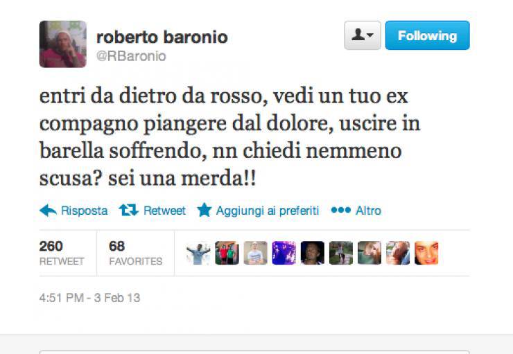 Roberto Baronio perde le staffe su Twitter. Durante Lazio–Genoa l’ex biancoceleste Matuzalem ha falciato da dietro Cristian Brocchi (carriera finita, clicca qui per leggere), costringendolo ad uscire in barella e tra le lacrime. Baronio su Twitter non gliele ha mandate a dire: “Entri da dietro da rosso, vedi un tuo ex compagno piangere dal dolore e uscire in barella, non chiedi nemmeno scusa? Matuzalem sei un uomo di m…! I problemi personali risolvili da uomo! La settimana prossima si saprà se quella ‘tranquilla’ entrata da dietro al mio amico Brocchi abbia fatto veramente male o no, per adesso è in stampelle! Matuzalem m…!”.