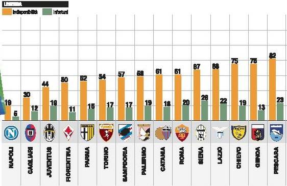 Il Napoli corre, salta, vince e non si rompe. E conquista anche in questa prima parte di stagione (i dati evidenziati nel grafico sono riferiti al girone di andata) il titolo di squadra più in salute della serie A. Le statistiche sugli infortuni sono inconfutabili e dimostrano peraltro che la squadra di Mazzarri finora ha «sofferto» solo piccoli problemi come distorsioni e affaticamenti rispetto agli infortuni più gravi delle altre squadre, Milan in testa.