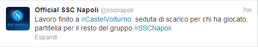 E’ appena concluso l’allenamento a Castel Volturno. I calciatori azzurri si sono divisi tra quelli che hanno giocato ieri sera e chi no. Per i primi solo una seduta di scarico, un partitella per i secondi. Ecco il tweet del profilo ufficiale Twitter degli azzurri: “Lavoro finito a #CastelVolturno: seduta di scarico per chi ha giocato, partitella per il resto del gruppo #SSCNapoli”.
