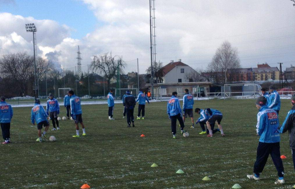 FOTO – Rifinitura degli azzurri nel gelo polare di Plzen a -7° 21/02/2013 di vincenzomatino Nel gelo di Plzen il Napoli essegue la rifinitura in vista del match di stasera. Ecco la foto pubblicata sul profilo Twitter della società:
