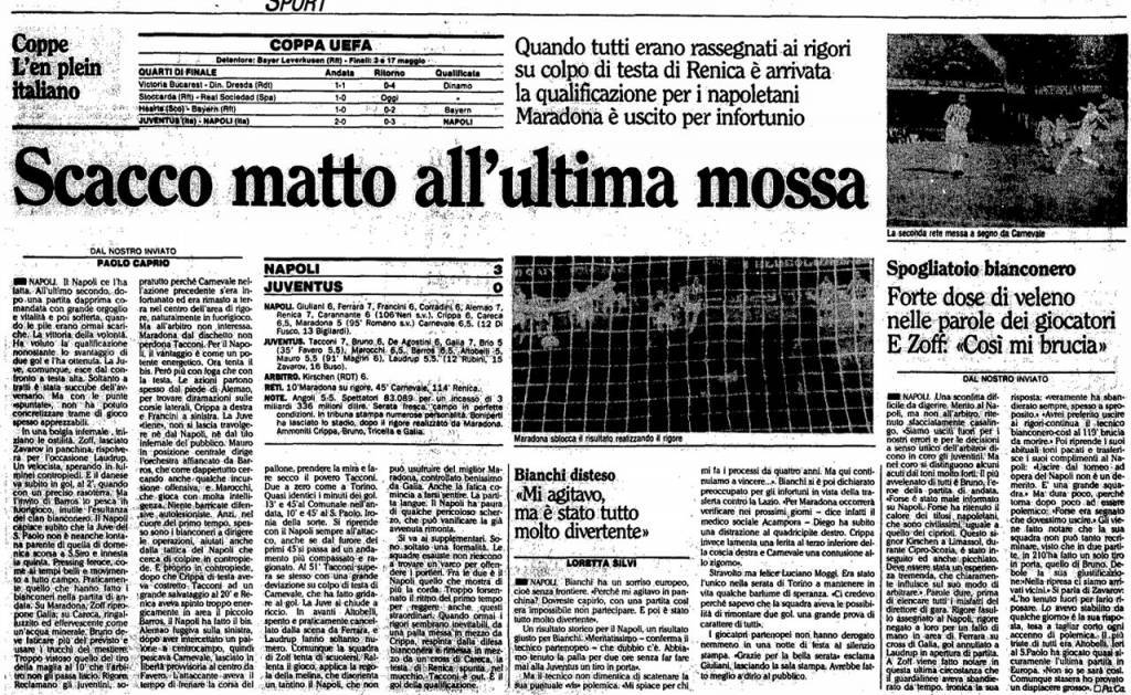 Ma si parlava di gare e rimonte impossibili. Il ritorno di Coppa Uefa al San Paolo il 15 marzo 1989 era una di queste. Quella notte il San Paolo era come una pentola sul fuoco con temperatura a 1000 gradi: pronta ad esplodere anche per un solo gol degli azzurri. Figuriamoci quando alla fine del primo tempo Maradona e Carnevale ‘pareggiarono’ il 2-0 dell’andata. Il destino decise che quella notte doveva essere magica e infliggere una lezione, di quelle sonore, alla Juventus. E quale modo migliore di beffarla a un minuto dalla fine dei tempi supplementari? Renica scrisse la storia, poi sappiamo tutti come andò a finire.