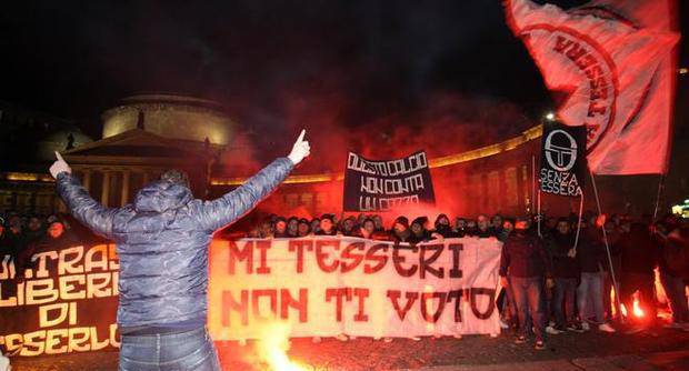 Lo avevano annunciato e lo hanno fatto. Esponenti del tifo napoletano si sono riuniti in serata in Piazza del Plebiscito per levare la propria voce. Secondo quanto riferisce ‘Il Mattino.it’, i tifosi hanno evidenziato che la manifestazione è nata solo per protestare contro l’obbligo del tesseramento, senza alcuna connotazione politica. Circa mille tifosi hanno intonato lo slogan “Tu mi tesseri, io non ti voto“, stracciando e bruciando tessere elettorali. Ma secondo quanto riferito dalla Questura si trattava di fotocopie. I manifestanti si sono concentrati in piazza Dante e avrebbero voluto attraverso le strade del centro. Ma il corteo è stato impedito dalla polizia. Di seguito ecco il video de ‘Il Mattino.it’