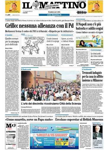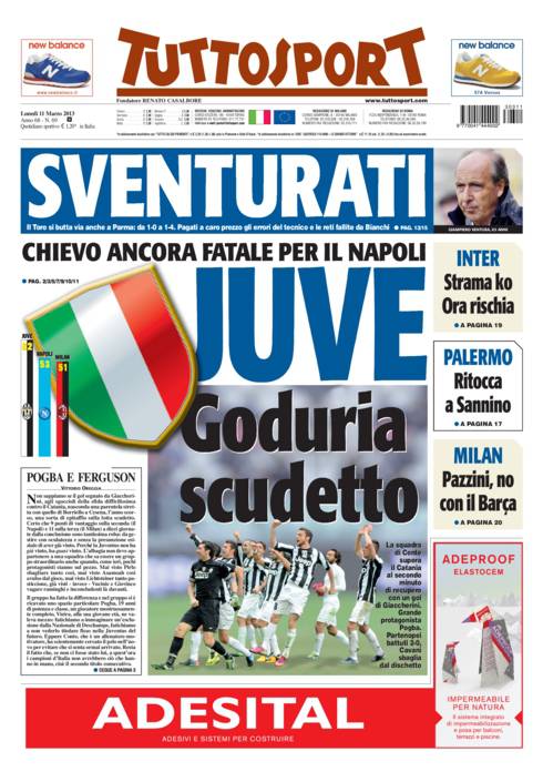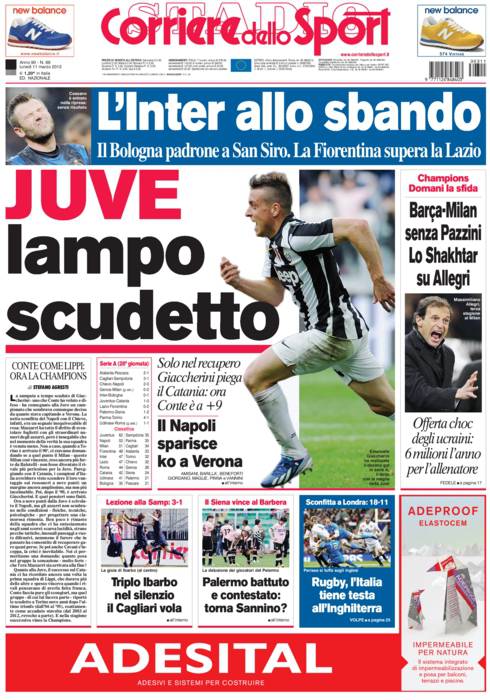 RASSEGNA STAMPA – Le prime pagine dei quotidiani sportivi 11/03/201311/03/2013 di antoizzo Titoli dei giornali che ovviamente celebrano l’ipoteca allo scudetto messa dalla Juve, considerato anche il passo falso a Verona del Napoli. A.I.
