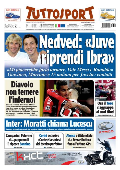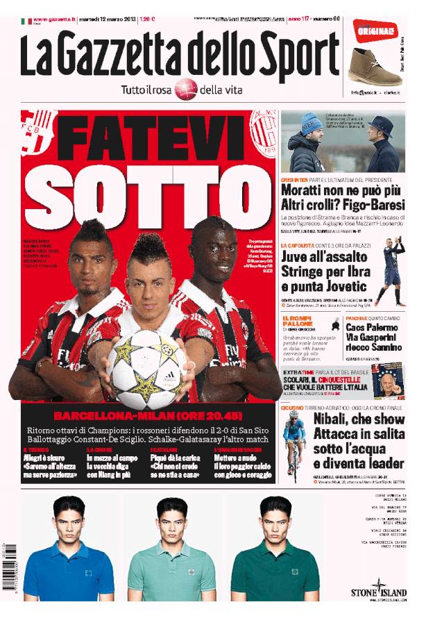 RASSEGNA STAMPA – Le prime pagine dei quotidiani sportivi 12/03/201312/03/2013 di antoizzo Le prime pagine dei giornali di questa mattina parlano in particolare del Milan, che stasera tenterà di eliminare il Barcellona dalla Champions. Un’impresa non proibitiva, dopo il 2-0 dell’andata a favore dei rossoneri. A.I.