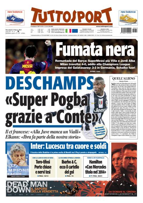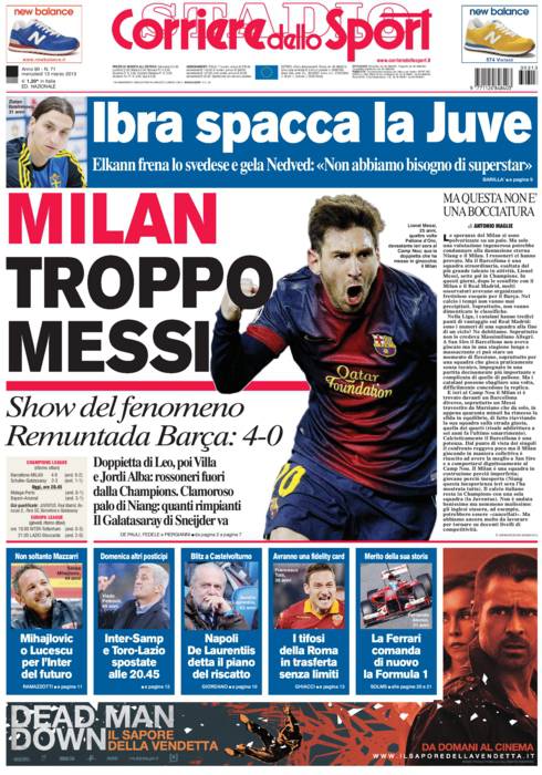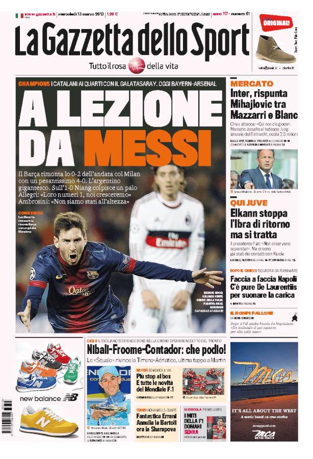 RASSEGNA STAMPA – Le prime pagine dei quotidiani sportivi in edicola 13/03/201313/03/2013 di antoizzo Prime pagine dei quotidiani sportivi ovviamente dedicate alla ‘remuntada’ del Barcellona sul Milan. Intanto gli azzurri attendono il faccia a faccia con il proprio presidente, Aurelio De Laurentiis. A.I.