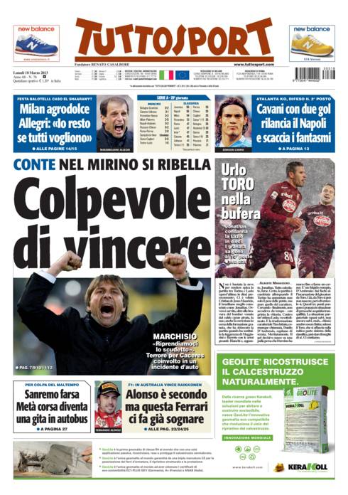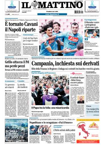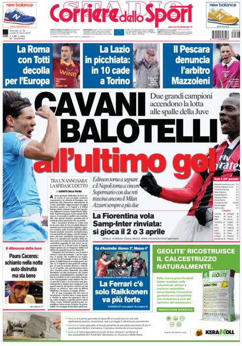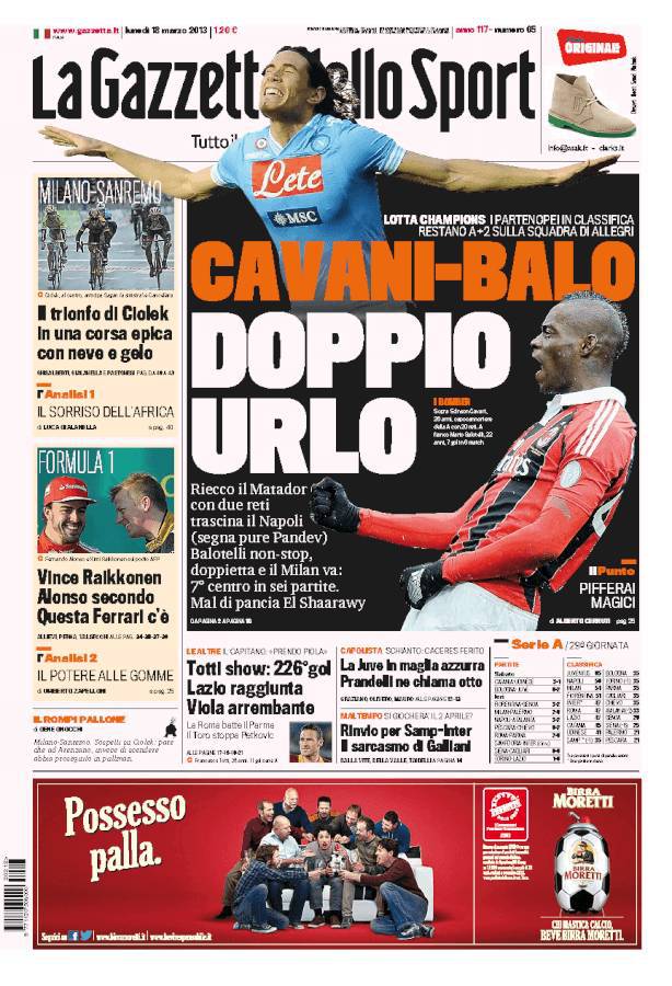 RASSEGNA STAMPA – Le prime pagine dei quotidiani sportivi 18/03/201318/03/2013 di antoizzo Molto Napoli nei titoli principali dei giornali, in particolare il ritorno al gol di Cavani A.I.