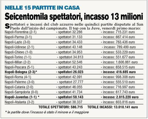 Sono quindici le gare disputate finora dal Napoli al San Paolo in campionato. Solo in una circostanza meno di 30 mila spettatori hanno affollato gli spalti per un totale di poco meno di 600 mila persone. Un buon dato riscontrato anche negli incassi. In totale sono affluiti nelle casse circa 13 milioni di euro. Ovviamente l’incasso maggiore è stato quello del primo marzo, in occasione di Napoli-Juventus: quasi 3 milioni di euro a fronte di 58 mila paganti.