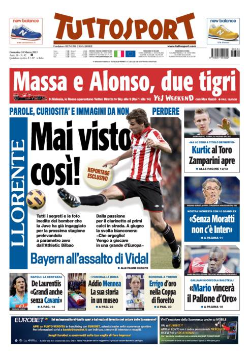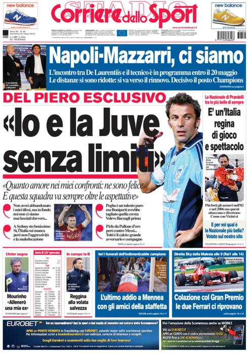 RASSEGNA STAMPA – Le prime pagine dei quotidiani sportivi 24/03/201324/03/2013 di antoizzo Annunciato l’incontro tra De Laurentiis e Mazzarri da parte del ‘Corriere dello Sport’. A.I.