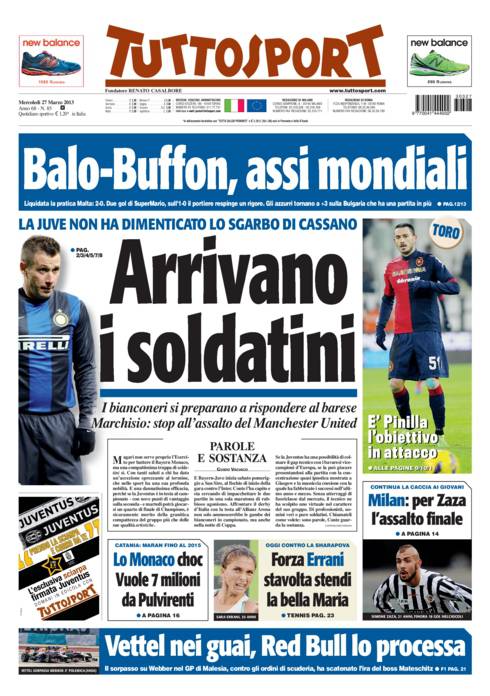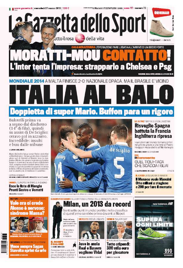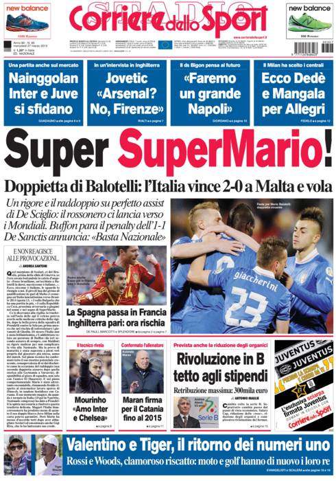 RASSEGNA STAMPA – Le prime pagine dei quotidiani sportivi 27/03/201327/03/2013 di antoizzo Prime pagine dei quotidiani dedicate alla vittoria della Nazionale su Malta grazie a Balotelli e a Buffon A.I.
