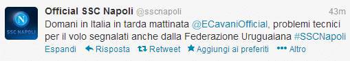 Edinson Cavani tornerà nella tarda mattinata di domani a Napoli. Lo si apprende dal profilo twitter ufficiale del calcio Napoli. Motivo del ritardo, si apprende dal social network, i problemi tecnici per il volo segnalati anche dalla Federazione Uruguaiana.
