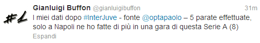 Quest’oggi nella gara tra Inter e Juventus, Gigi Buffon ha effettuato 5 parate. Come scrive il numero uno bianconero sul proprio profilo twitter, solo in una circostanza quest’anno è stato impegnato di più, ovvero nella gara del primo marzo al San Paolo contro il Napoli, dove è stato chiamato in causa in 8 circostanze