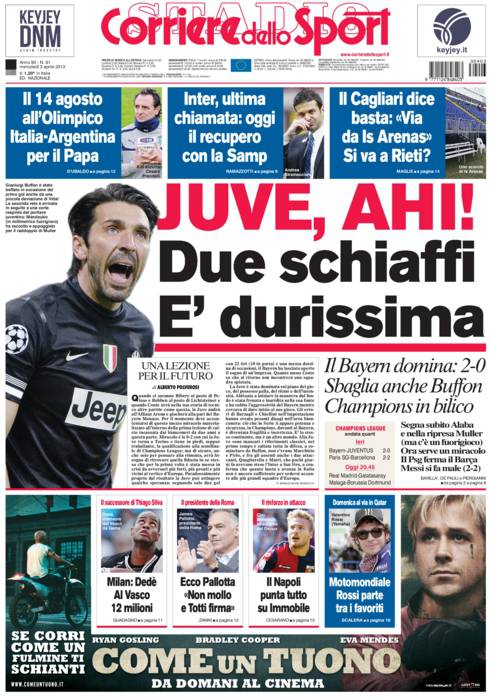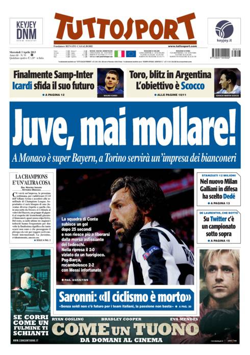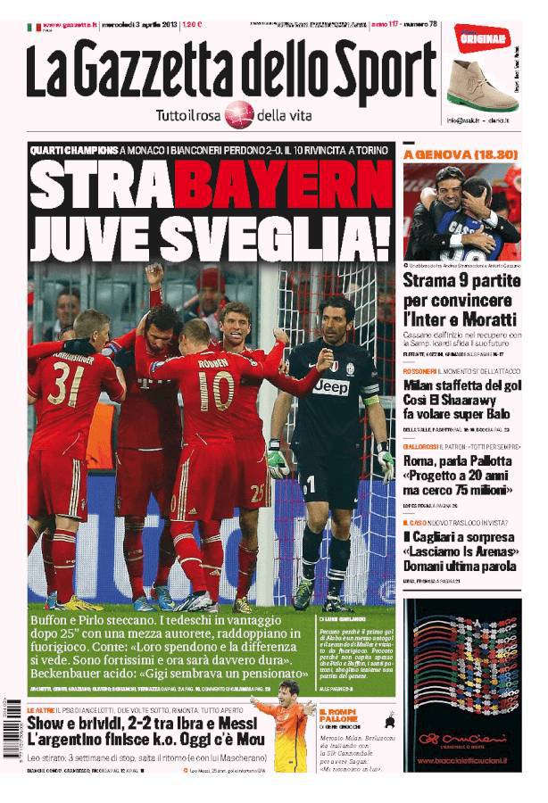 RASSEGNA STAMPA – Le prime pagine dei quotidiani sportivi 03/04/201303/04/2013 di antoizzo Prime pagine dedicate alla disfatta della Juventus contro il Bayern Monaco. Per il Napoli si parla di un possibile arrivo di Immobile A.I.
