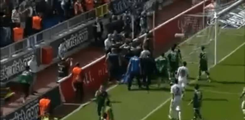 E’ successo in Turchia, al termine della partita fra Kasimpasa e Bursaspor vinta 2-0 dai padroni di casa. Un tifoso entra in campo intento a prendere in giro il portiere del Bursaspor, Harun Tekin. Vola qualche parola grossa e l’estremo difensore non riesce a mantenere la calma e travolge l’incauto supporter con schiaffi e pugni almeno fino a quando gli agenti della sicurezza non riescono a trascinarlo fuori.