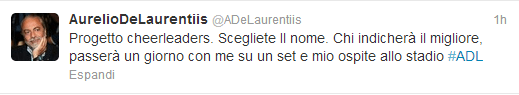 FOTO – De Laurentiis bandisce una gara su Twitter. Ecco il premio per il vincitore 09/04/2013 di Antonio Papa Il patron del Napoli si lancia in una nuova iniziativa tutta azzurra: il nome delle cheerleaders del club partenopeo scelto dai tifosi. Il più bello sarà premiato, ecco come: M.G.