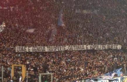 Durante Roma-Lazio di ieri sera, i tifosi bianconcelesti hanno esposto uno striscione contro i romanisti. Il significato di tale striscione si può ricondurre al fatto che questi ultimi hanno disertato le trasferte a Catania e Napoli, dove le tifoserie di casa sono molto ostili a quella giallorossa: