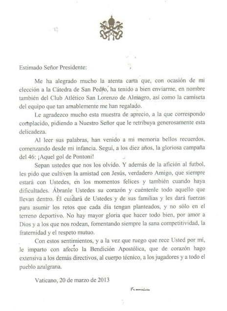 Il San Lorenzo ha reso noto la lettera inviatagli da Papa Francesco. Nella lettera, il Pontefice ha ricordato la sua infanzia e lo scudetto vinto nel 1946 benedicendo tutti i sostenitori azulgrana. Un ringraziamento particolare lo rivolge anche per la maglietta ricevuta in dono.
