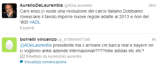 Continua la saga del botta e risposta su twitter tra il presidente del Napoli, Aurelio De Laurentiis e i tifosi azzurri. Questa volta il patron ha scelto di rispondere ad un tifoso che gli ha chiesto se per arrivare al livello delle grandi squadre europee, servissero grandi marchi come Nike o Adidas. De Laurentiis, come si evince dalla foto del tweet, ha parlato della ‘solita’ rivoluzione che vorrebbe portare nel mondo del calcio.