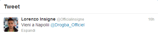 Insigne twitta Drogba: “Vieni a Napoli” 12/04/2013 di Antonio Papa Nelle ultime ore il giovane Insigne ha twittato Drogba. Ecco l’immagine tratta dal social network: M.G.