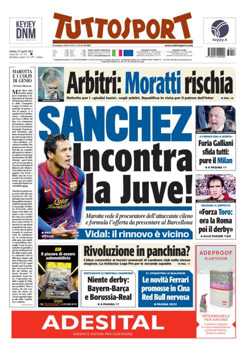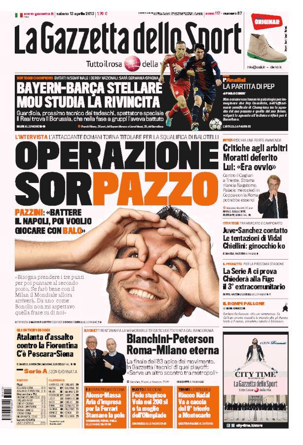 RASSEGNA STAMPA – Le prime pagine dei quotidiani sportivi 13/04/201313/04/2013 di antoizzo In attesa di Milan-Napoli, è pronto il rinnovo di Mazzarri. Intanto Pazzini annuncia battaglia, i rossonoeri tentano l’aggancio agli azzurri A.I.