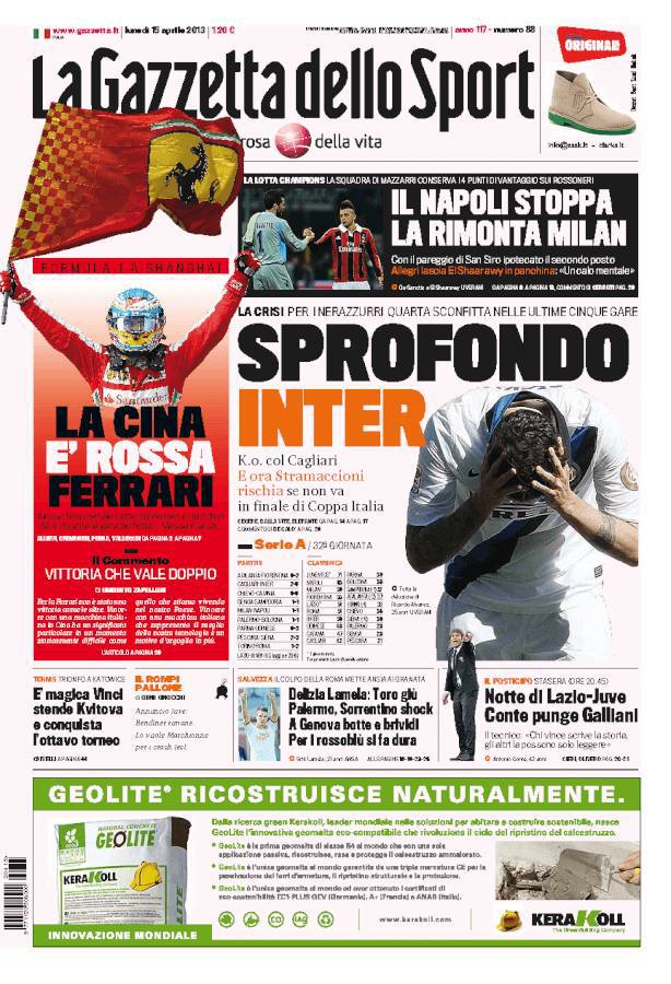 RASSEGNA STAMPA – Le prime pagine dei quotidiani sportivi 15/04/201315/04/2013 di antoizzo Risultato più positivo per gli azzurri che per i rossoneri, secondo le prime pagine dei giornali, quello di ieri sera a San Siro tra Milan e Napoli A.I.