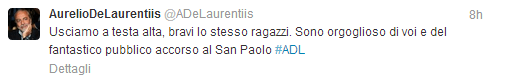 Al termine della gara di Coppa Italia Primavera contro la Juventus, il presidente Aurelio De Laurentiis si è complimentato su twitter con gli azzurrini, postando questo messaggio: “Usciamo a testa alto, bravi lo stesso. Sono orgoglioso di voi e del fantastico pubblico accorso al San Paolo”