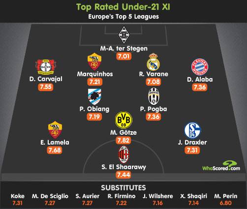 Il sito whoscored.com ha stilato una speciale formazione con i migliori under al mondo. In porta troviamo Marc-André ter Stegen, classe 1992, portiere del Borussia Mönchengladbach e della Nazionale Tedesca. In difesa abbiamo: Daniel Carvajal Ramos, classe 1992, spagnolo, difensore del Bayer Leverkusen; Marquinhos, brasiliano, classe 1994. centrale della Roma; Varane, classe 1993, francese, difensore del Real Madrid; Alaba, classe 1992, austriaco, difensore del Bayern Monaco. Davanti alla difesa abbiamo Obiang, classe 1992, in forza alla Sampdoria e Pogba, francese, classe 1993, talento della Juventus. Sulla trequarti troviamo Erik Lamela, argentino, classe 1992, in forza alla Roma; Mario Götze, classe 1992, tedesco in forza al Borussia Dortmund; Draxler, tedesco, classe 1993, centrocampista in forza allo Shalke 04. In attacco El Shaarawy, classe 1992, in forza al Milan.