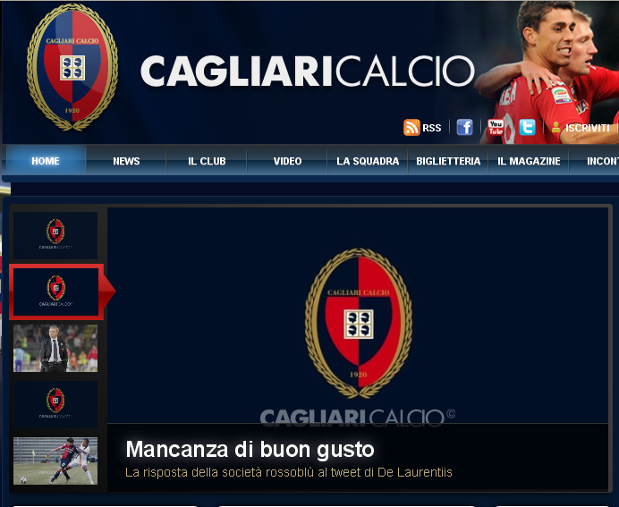 Ecco invece la foto e il titolo che campeggia sul sito ufficiale del cagliari calcio.