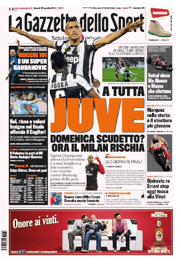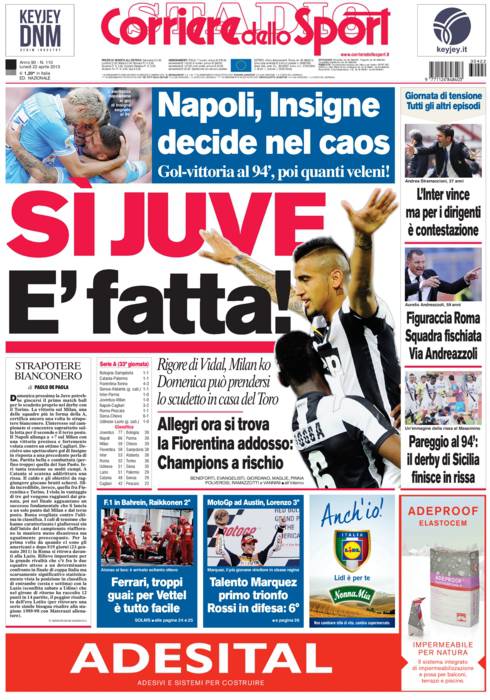 RASSEGNA STAMPA – Le prime pagine dei quotidiani sportivi 22/04/201322/04/2013 di antoizzo Titoli e foto dedicati a Lorenzo Insigne, autore del gol che ha steso il Cagliari e che ha permesso di portarsi a +7 sul Milan, sconfitto allo Stadium. A.I.