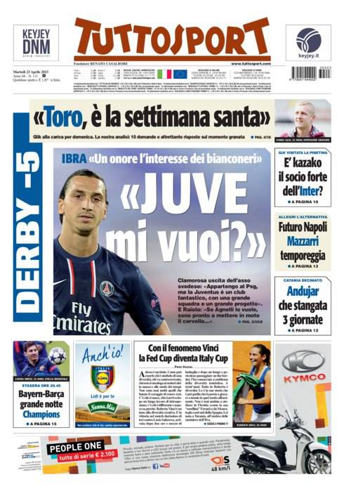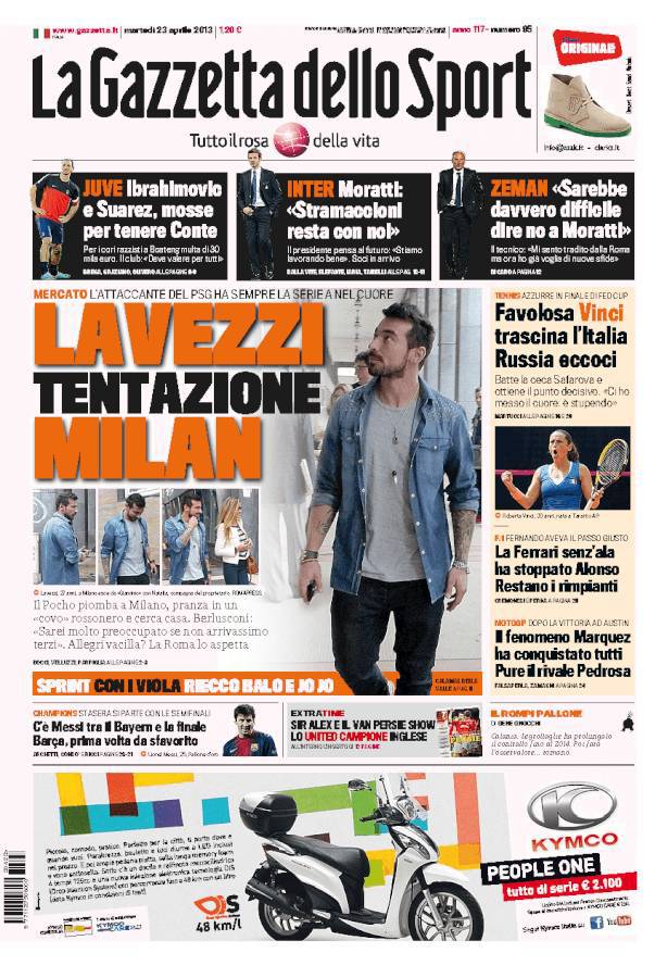 RASSEGNA STAMPA – Le prime pagine dei quotidiani sportivi 23/04/201323/04/2013 di antoizzo Secondo quanto riporta la ‘Gazzetta dello Sport’, il Milan vuole acquistare il Pocho Lavezzi A.I.